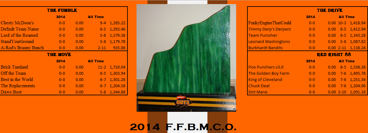 That said, with all 20 of us returning, the divisions will remain the same. However this year, each team in The Fumble will play each team in The Drive. Each team in The Move will play each team in Red Right 88. (Last year The Fumble played The Move and The Drive played Red Right 88). As was the case last year and will always be the case, each player will play their fellow divisional teams twice.