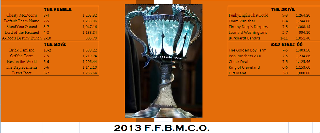 -Chesty McDoon’s/A-Rod’s Brauny Bunch with Chuck Deal/Burkhardt Bandits as #1 overall draft pick rights are definitely in play for the 2014 draft.